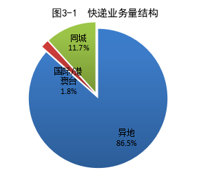 1-10月,同城、異地、國(guó)際/港澳臺(tái)快遞業(yè)務(wù)量分別占全部快遞業(yè)務(wù)量的11.7%、86.5%和1.8%;業(yè)務(wù)收入分別占全部快遞業(yè)務(wù)收入的6.5%、49.3%和10.8%。與去年同期相比,同城快遞業(yè)務(wù)量的比重下降1.4個(gè)百分點(diǎn),異地快遞業(yè)務(wù)量的比重上升1.6個(gè)百分點(diǎn),國(guó)際/港澳臺(tái)業(yè)務(wù)量的比重下降0.2個(gè)百分點(diǎn)。