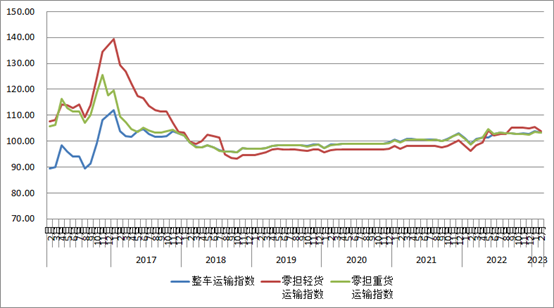 分車型指數(shù)看,各車型指數(shù)環(huán)比均有回落,同比去年保持增長。以大宗商品及區(qū)域運輸為主的整車指數(shù)為103.3點,比上月回落0.33%,比上年同期增長4.5%。零擔指數(shù)中,零擔輕貨指數(shù)為103.8點,比上月回落1.66%,比上年同期增長7.9%;零擔重貨指數(shù)為103.3點,比上月回落0.28%,比上年同期增長4.6%。