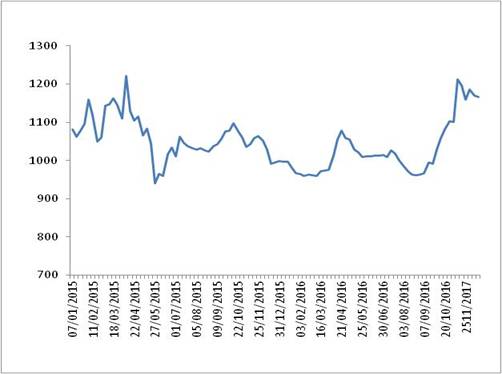 圖 1 2015-2016年各周中國公路物流運價指數(shù)