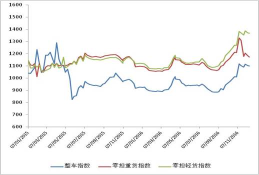 本周,公路物流市場需求總體延續(xù)了前期的平穩(wěn)走勢。但前期因受到治超、“雙十一”等綜合因素影響,價格上漲明顯,波動幅度增大。近期隨著需求回穩(wěn),價格指數(shù)隨之有所回調(diào),但總體仍高于上年同期水平。從后期走勢看,未來公路運輸市場需求有望保持平穩(wěn)增長態(tài)勢,運價指數(shù)可能將延續(xù)小幅回調(diào)走勢。