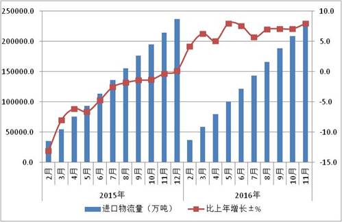 從不同品類看,鐵礦砂、原油、煤等大宗商品進(jìn)口量增加。1-11月,中國進(jìn)口物流量鐵礦砂增長9.2%;原油增長14%;煤增長22.7%。