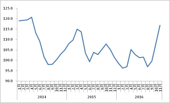 公路物流運價穩(wěn)步回升。由中國物流與采購聯(lián)合會和林安物流集團(tuán)聯(lián)合調(diào)查的中國公路物流運價指數(shù)11月為116.8點,比上月回升8.0%,比上年同期增長。公路物流需求保持平穩(wěn)較快增長態(tài)勢,公路運價指數(shù)連續(xù)三個月環(huán)比回升,同時也是受到治超新政等因素影響,運輸費用水平有所上漲。年內(nèi)累計價格指數(shù)總體略低于上年同期水平,1-11月平均指數(shù)為102.2點,同比下降4.2%,但降幅較1-10月收窄1.6個百分點。