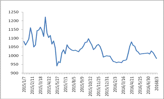 圖 1 2015-2016年各周中國公路物流運價指數(shù)