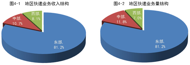 1-7月份,東、中、西部地區(qū)快遞業(yè)務(wù)收入的比重分別為81.2%、10.7%和8.1%,業(yè)務(wù)量比重分別為81.2%、11.8%和7.0%。與去年同期相比,東部地區(qū)快遞業(yè)務(wù)收入比重下降了0.5個百分點,快遞業(yè)務(wù)量比重下降了0.4個百分點;中部地區(qū)快遞業(yè)務(wù)收入比重上升了0.3個百分點,快遞業(yè)務(wù)量比重上升了0.4個百分點;西部地區(qū)快遞業(yè)務(wù)收入比重上升了0.2個百分點,快遞業(yè)務(wù)量比重持平。