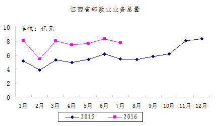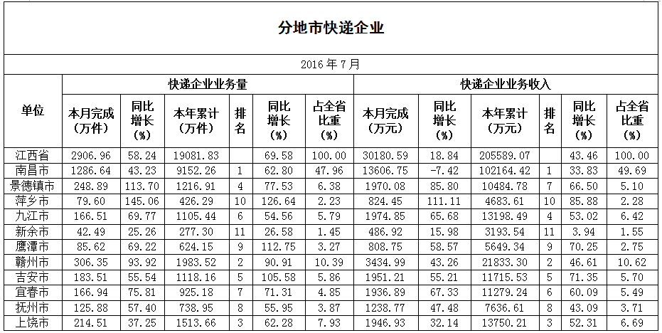 2016年7月,江西省郵政企業(yè)和快遞服務企業(yè)業(yè)務收入(不包括郵政儲蓄銀行直接營業(yè)收入)本年累計完成42.53億元,同比增長26.69%,全國排第19位;郵政企業(yè)和快遞服務企業(yè)業(yè)務總量本年累計完成52.65億元,同比增長45.75%,全國排名第15位。