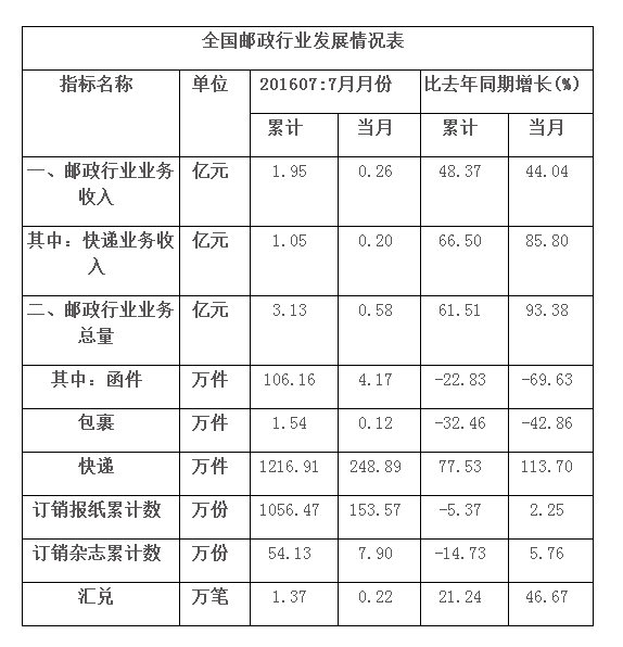 2016年7月,景德鎮(zhèn)市郵政函件業(yè)務(wù)完成4.17萬(wàn)件,同比下降69.63%;包裹業(yè)務(wù)完成0.12萬(wàn)件,同比下降42.86%;報(bào)紙業(yè)務(wù)完成153.57萬(wàn)份,同比增長(zhǎng)2.25%;雜志業(yè)務(wù)完成7.90萬(wàn)份,同比增長(zhǎng)5.76%;匯兌業(yè)務(wù)累計(jì)完成0.22萬(wàn)筆,同比增長(zhǎng)為46.67%。