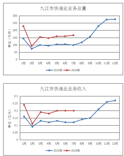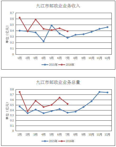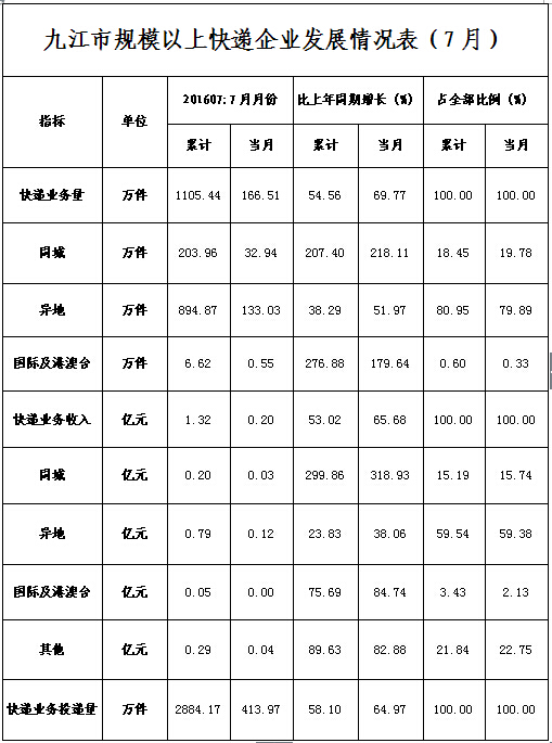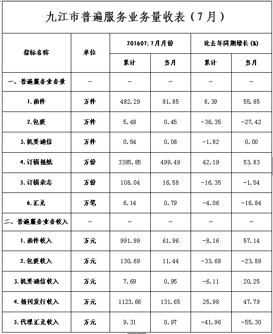2016年7月,九江市郵政業(yè)業(yè)務(wù)收入完成(不包括郵政儲(chǔ)蓄銀行直接營業(yè)收入)0.39億元,本年累計(jì)完成3.27億元,同比增長(zhǎng)31.22%;業(yè)務(wù)總量完成0.52億元,本年累計(jì)完成3.83億元,同比增長(zhǎng)41.65%。