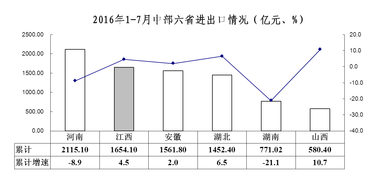 中部各省進(jìn)出口情況繼續(xù)好轉(zhuǎn)。1-7月,江西進(jìn)出口總值1654.1億元,增長(zhǎng)4.5%,比上半年加快4.5個(gè)百分點(diǎn),增速由正轉(zhuǎn)負(fù),居中部第3位,前進(jìn)了1位,總量排名繼續(xù)居中部第2位。各省按增速排名依次為:山西10.7%、湖北6.5%、江西4.5%、安徽2.0%、河南-8.9%、湖南-21.1%。