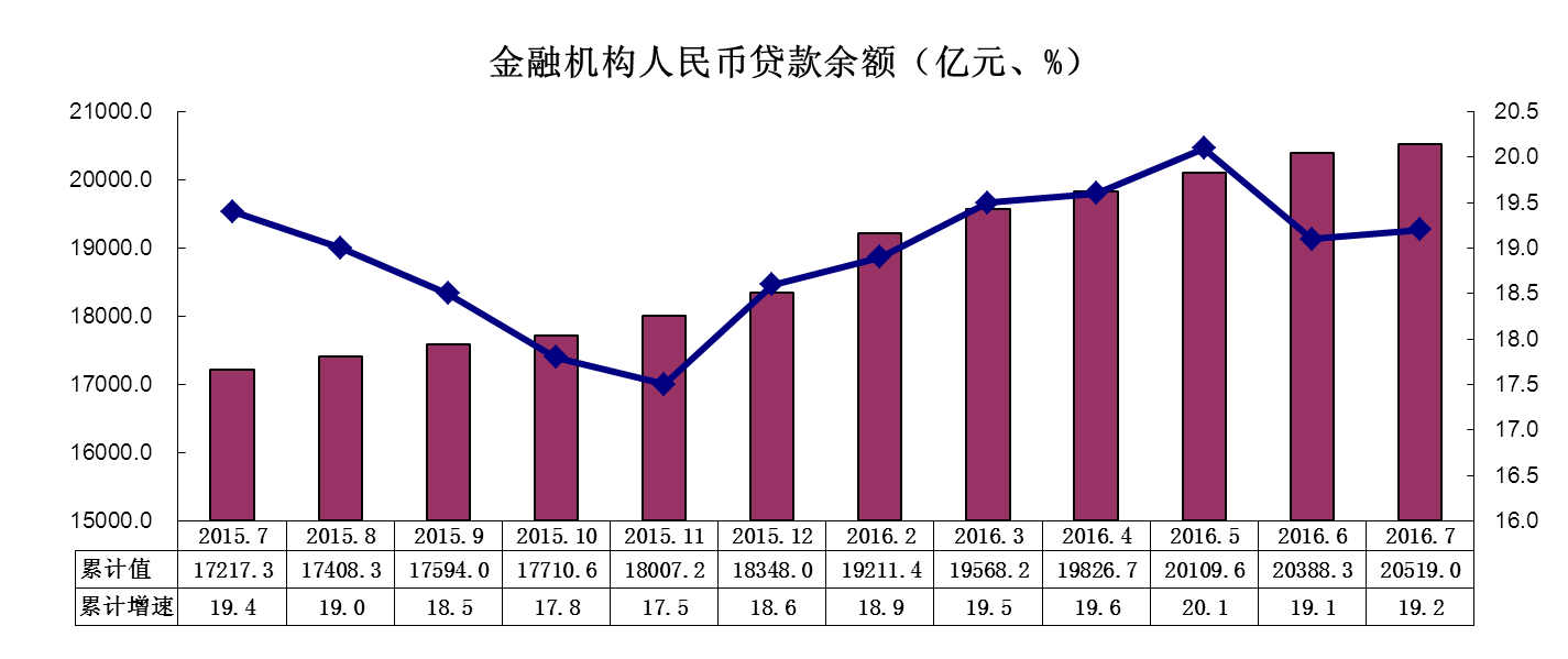 (二)人民幣貸款增速有所回升。1-7月,全省金融機(jī)構(gòu)人民幣存款余額為27634億元,增長(zhǎng)17.3%,累計(jì)增速較上半年加快1.1個(gè)百分點(diǎn)。貸款增速有所回升,1-7月,全省金融機(jī)構(gòu)人民幣貸款余額20519億元,增長(zhǎng)19.2%,累計(jì)增速較上半年小幅回升0.1個(gè)百分點(diǎn),但較一季度回落0.3個(gè)百分點(diǎn),反映金融對(duì)實(shí)體經(jīng)濟(jì)的支持力度依然不強(qiáng)。