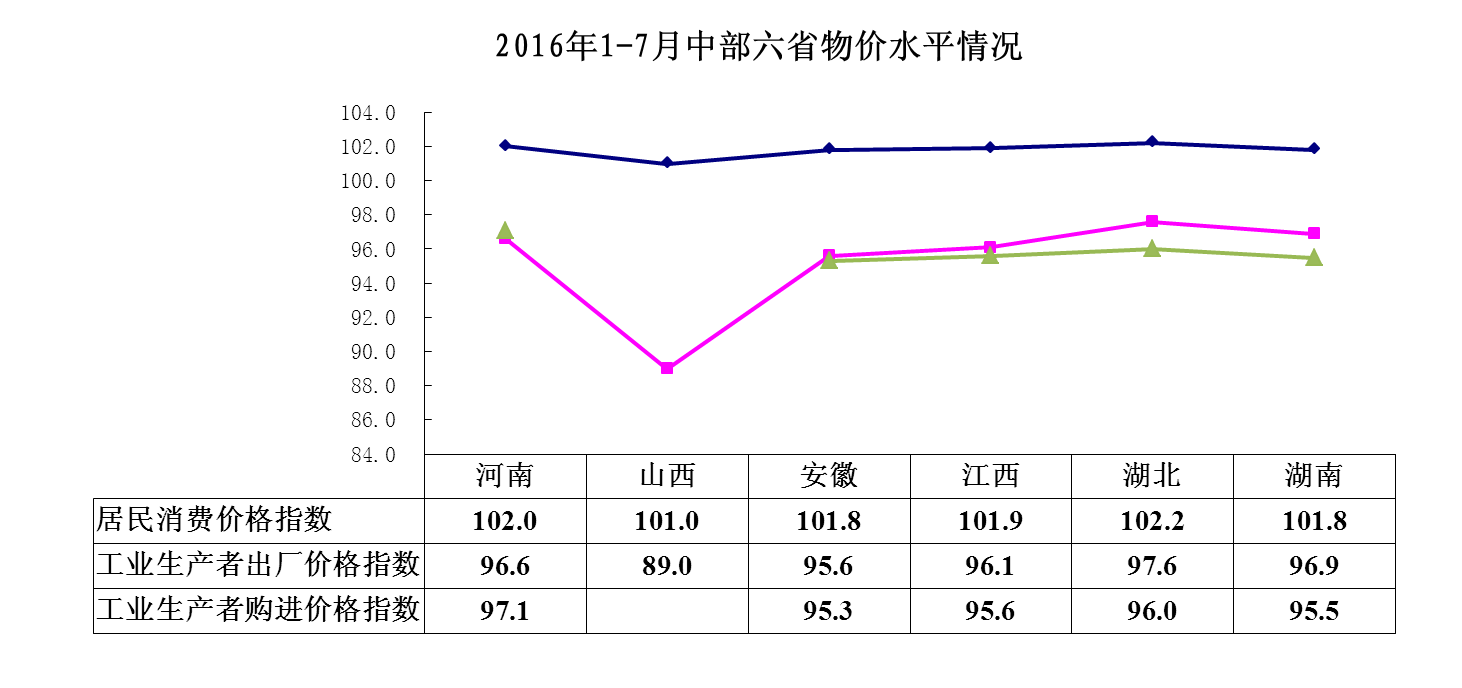 1-7月,中部居民消費(fèi)價(jià)格基本穩(wěn)定,湖北漲幅較上半年上升0.1個(gè)百分點(diǎn),湖南漲幅較上半年回落0.1個(gè)百分點(diǎn),其他省份漲幅與上半年持平。我省居民消費(fèi)價(jià)格指數(shù)為101.9,漲幅與上半年持平,居中部第3位。各省按增速排名依次為:湖北102.2、河南102.0、江西101.9、湖南101.8、安徽101.8、山西101.1。