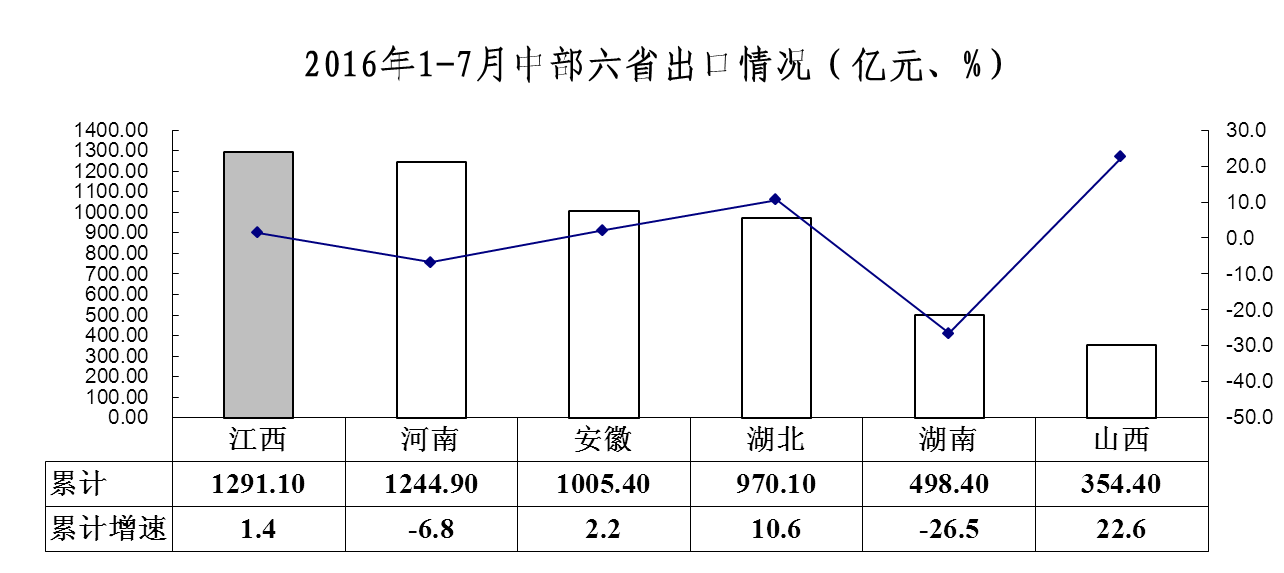 中部各省出口形勢(shì)與進(jìn)出口形勢(shì)基本一致,出口呈現(xiàn)趨穩(wěn)向好的跡象。1-7月,我省出口完成1291.1億元,由上半年的下降4.2%轉(zhuǎn)為增長(zhǎng)1.4%,增速加快了5.6個(gè)百分點(diǎn),繼續(xù)居中部第4位,總量居中部第1位。各省按增速排名依次為:山西22.6%、湖北10.6%、安徽2.2%、江西1.4%、河南-6.8%、湖南-26.5%。