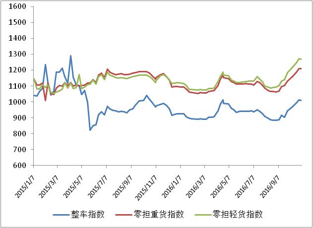 各車型指數(shù)環(huán)比均有不同程度回落,其中整車指數(shù)、零擔重貨運輸指數(shù)環(huán)比回落幅度略高于零擔輕貨指數(shù)。本周,整車指數(shù)為1010.6點,環(huán)比回落0.2%,但比年初回升9.2%;零擔輕貨指數(shù)為1269.3點,環(huán)比回落0.1%;零擔重貨指數(shù)為1208.5點,環(huán)比回落0.2%。
