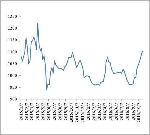 圖 1 2015-2016年各周中國公路物流運價指數(shù)