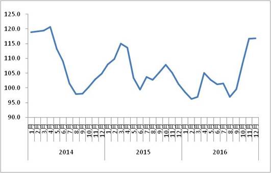 由中國物流與采購聯(lián)合會和林安物流集團(tuán)聯(lián)合調(diào)查的中國公路物流運價指數(shù)2016年12月為116.8點,比上月回升0.06%,運價指數(shù)連續(xù)四個月環(huán)比回升,比上年同期增長15.3%,全年總體高于去年同期水平。9月份以來,受到治超新政實施等因素影響,運輸費用持續(xù)上漲,加之物流需求穩(wěn)中有升,多重因素共同影響,帶動價格指數(shù)連續(xù)回升。