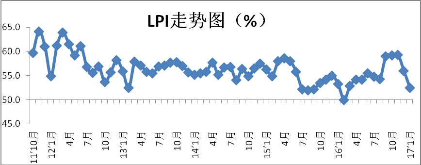 中國(guó)物流與采購(gòu)聯(lián)合會(huì)發(fā)布的2017年1月份中國(guó)物流業(yè)景氣指數(shù)為52.5%較上月回落3.5個(gè)百分點(diǎn);中國(guó)倉(cāng)儲(chǔ)指數(shù)為51%,較上月回落1.7個(gè)百分點(diǎn);中國(guó)公路物流運(yùn)價(jià)指數(shù)為118.8點(diǎn),比上月回升1.7%。