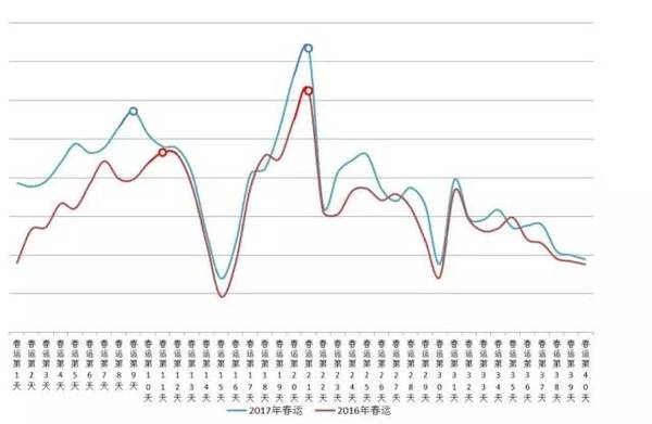 與去年相比,重要節(jié)點(diǎn)總流量同比上升11%。2017年春運(yùn)啟動(dòng)時(shí)間較2016年提前11天,節(jié)前返鄉(xiāng)重要節(jié)點(diǎn)流量高峰較去年相比,具有來得早、時(shí)間長、峰值高等特點(diǎn),節(jié)前高峰出現(xiàn)在春運(yùn)第9天(1月21日),較2016年春運(yùn)提前2天,步入平穩(wěn)高峰并一直持續(xù)至1月24日(臘月二十七)。