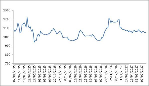 圖 1 2015-2017年各周中國(guó)公路物流運(yùn)價(jià)指數(shù)
