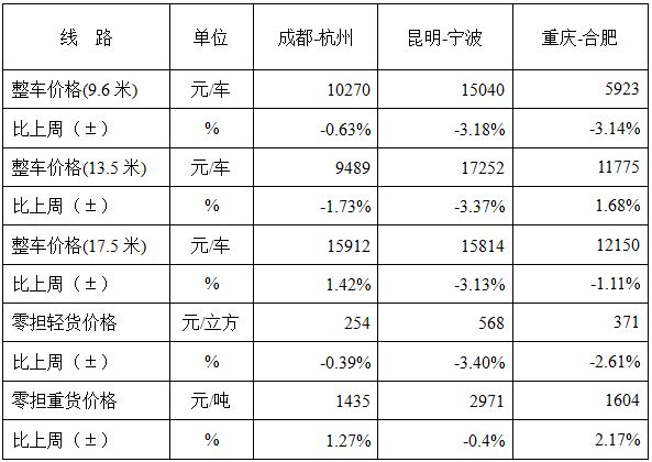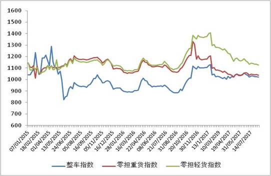 各車型指數(shù)波動(dòng)幅度較小但均有不同程度回落,零擔(dān)指數(shù)回落幅度高于整車指數(shù)。其中,整車指數(shù)為1021.6點(diǎn),比上周回落0.43%,比上年同期增長(zhǎng)13.8%;零擔(dān)輕貨指數(shù)為1126.2點(diǎn),環(huán)比回落0.65%;零擔(dān)重貨指數(shù)為1038.0點(diǎn),環(huán)比回落0.45%。