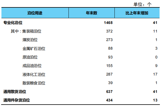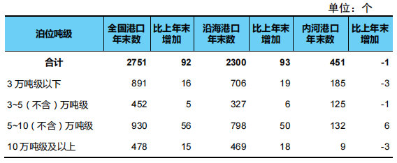 年末全國港口萬噸級及以上泊位2751個,比上年末增加92個。從分布結(jié)構(gòu)看,沿海港口萬噸級及以上泊位2300個、增加93個,內(nèi)河港口萬噸級及以上泊位451個、減少1個。從用途結(jié)構(gòu)看,專業(yè)化萬噸級及以上泊位1468個、增加41個,通用散貨萬噸級及以上泊位637個、增加41個,通用件雜貨泊位434個、增加13個。