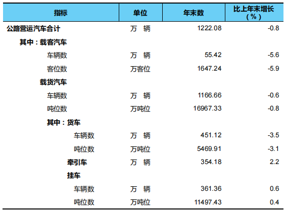 年末全國擁有公路營運(yùn)汽車1222.08萬輛。分結(jié)構(gòu)看,擁有載客汽車55.42萬輛、1647.24萬客位,比上年末分別減少3.28萬輛、103.79萬客位;擁有載貨汽車1166.66萬輛、16967.33萬噸位,分別減少6.60萬輛、132.17萬噸位,其中,普通貨車387.69萬輛、4716.19萬噸位,分別減少19.25萬輛、207.24萬噸位,專用貨車63.43萬輛、753.72萬噸位,分別增加3.05萬輛、34.96萬噸位,牽引車354.18萬輛、增加7.50萬輛,掛車361.36萬輛、增加2.11萬輛。