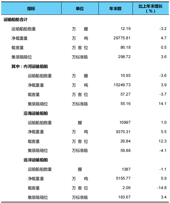 年末全國擁有水上運(yùn)輸船舶12.19萬艘,比上年末減少0.40萬艘,凈載重量2.98億噸、增加0.13億噸,載客量86.18萬客位、增加0.40萬客位,集裝箱箱位298.72萬標(biāo)準(zhǔn)箱、增加10.29萬標(biāo)準(zhǔn)箱。