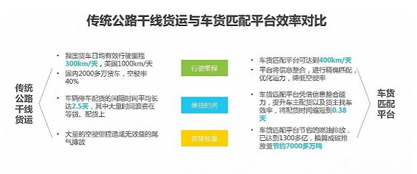目前,我國(guó)的公路物流貨運(yùn)量占到了整體貨運(yùn)量的80%,干線物流在整個(gè)公路物流中占比最大,但是行業(yè)整體運(yùn)作效率不高,我國(guó)貨車(chē)日均有效行駛里程300km/天,美國(guó)則可以達(dá)到1000km/天。國(guó)內(nèi)2000多萬(wàn)貨車(chē),空駛率40%。造成資源錯(cuò)配、效率低下的原因主要在于信息的不對(duì)稱(chēng)性,車(chē)貨匹配平臺(tái)利用信息技術(shù)將線下信息進(jìn)行整合,發(fā)布信息并進(jìn)行精準(zhǔn)匹配,可以?xún)?yōu)化供應(yīng)鏈下游的貨物與司機(jī)的資源分配,降低空駛率,進(jìn)而節(jié)約運(yùn)輸成本。