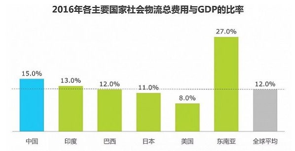 2016年,社會(huì)物流總費(fèi)用為11.1萬(wàn)億元,同比增長(zhǎng)2.9%,繼續(xù)保持低速增長(zhǎng)。社會(huì)物流總費(fèi)用與GDP的比率為14.9%,比上年下降1.1個(gè)百分點(diǎn),經(jīng)濟(jì)運(yùn)行中的物流成本有所下降,運(yùn)行的質(zhì)量有所提升。但與其他國(guó)家相比,仍存在一定差距。2016年我國(guó)物流費(fèi)用與GDP的比率高出全球平均水平3%,高出美國(guó)6個(gè)百分點(diǎn)。與同樣屬于發(fā)展中的人口大國(guó)-印度相比,我國(guó)的比率同樣處于較高水平。降本增效,提高物流運(yùn)行質(zhì)量是現(xiàn)階段國(guó)內(nèi)物流業(yè)發(fā)展的關(guān)鍵任務(wù)。