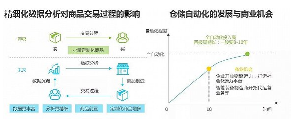 物流科技的創(chuàng)新將給傳統(tǒng)的商業(yè)模式帶來(lái)升級(jí)和變革。未來(lái),大數(shù)據(jù)、云計(jì)算等技術(shù)的成熟和應(yīng)用,可以更靈活的調(diào)整物流結(jié)構(gòu),由傳統(tǒng)先訂單后物流的模式,轉(zhuǎn)變?yōu)榉治鱿M(fèi)數(shù)據(jù),提前將一部分商品前置,或是生產(chǎn)符合客戶(hù)需求的定制化產(chǎn)品,精準(zhǔn)地配置庫(kù)存,降低成本。另外,自動(dòng)化設(shè)備方面,由于投資規(guī)模大,回報(bào)周期長(zhǎng),且改動(dòng)成本高,一般要求對(duì)業(yè)務(wù)不要具有太多的變化,但目前國(guó)內(nèi)商業(yè)發(fā)展活躍,變化快,因此10年內(nèi)一般不會(huì)實(shí)行倉(cāng)庫(kù)全自動(dòng)化,但自動(dòng)化程度會(huì)逐漸提高,較好的兼顧供應(yīng)鏈柔性。