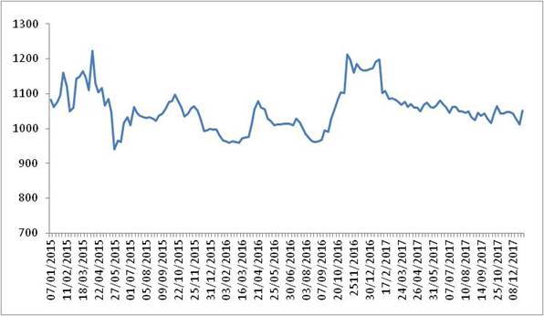 圖 1 2015-2018年各周中國(guó)公路物流運(yùn)價(jià)指數(shù)