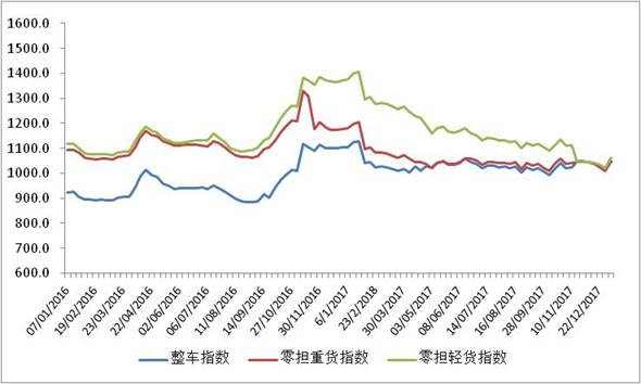 本周(2018年1月1日~1月5日),由中國(guó)物流與采購(gòu)聯(lián)合會(huì)和林安物流集團(tuán)聯(lián)合調(diào)查的中國(guó)公路物流運(yùn)價(jià)指數(shù)1051.29點(diǎn),環(huán)比回升3.9%。