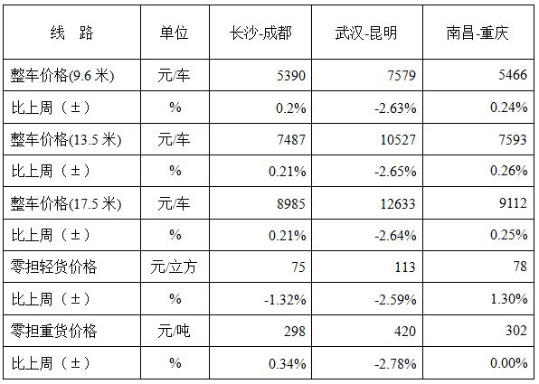 表1 本周部分線路平均價(jià)格及環(huán)比情況對(duì)比