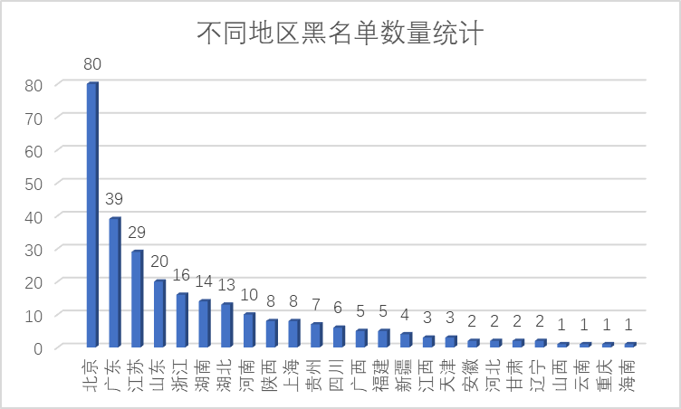 受誠信聯(lián)盟企業(yè)業(yè)務(wù)范圍影響,目前業(yè)務(wù)覆蓋區(qū)域來看,北京地區(qū)黑名單總數(shù)最多,所占比重最大,高達80條。黑名單記錄數(shù)大于10條省份有廣東、江蘇等7個,其余16省份失信記錄數(shù)均不足10條。由于無法統(tǒng)計地區(qū)交易記錄總數(shù),因此無法判定各地誠信水平,此統(tǒng)計表僅反映本次上報黑名單現(xiàn)狀,不做橫向比較。