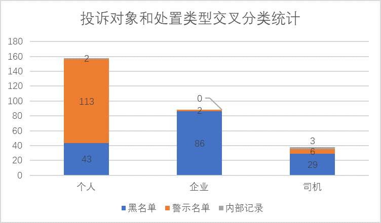 結(jié)合投訴對象與處置類型兩個維度,可知個人失信名單中,警示名單所占比例最大,而企業(yè)和司機失信名單中,黑名單所占比例最大。