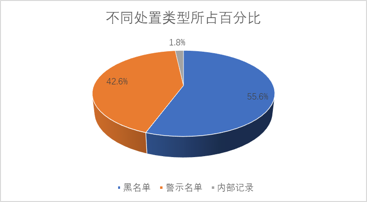 按處置類型看,黑名單記錄數(shù)所占比例最高,數(shù)量為158條,其次是警示名單記錄,數(shù)量為121條,內(nèi)部記錄名單僅有5條,占全部記錄的1.8%。