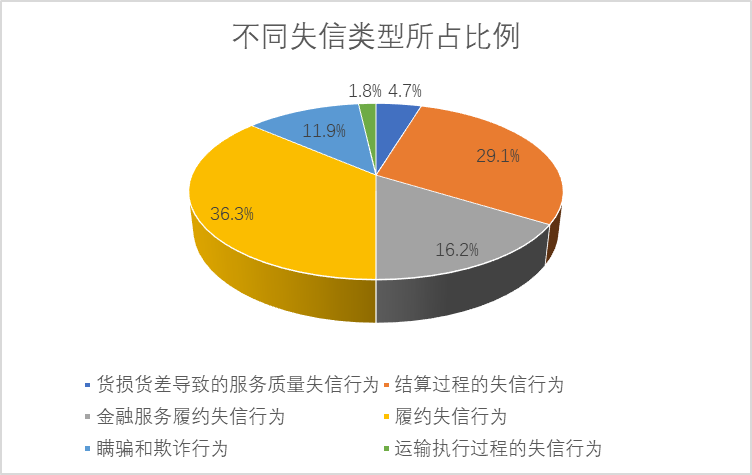 根據(jù)黑名單標(biāo)準(zhǔn)規(guī)定的六項失信行為,數(shù)量最多的為履約失信行為,占總記錄數(shù)的36.3%,其次是結(jié)算過程中的失信行為,占記錄總數(shù)的29.1%。而在運輸執(zhí)行過程中的失信行為和貨損貨差導(dǎo)致的失信行為所占比例較低,均不足5%。