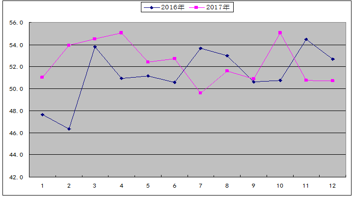 2017年新訂單指數均值雖較2016年提高3.0個百分點,但進入下半年以來,新訂單指數漲幅明顯收窄,7月份跌至2016年3月份以來的最低,下半年均值為53.7%,較上半年回落2.9個百分點。與此同時,2017年12月份商務活動預期指數跌至47.8%,時隔11個月后再度回落至50%以下的收縮區(qū)間,預示行業(yè)經營壓力加大。