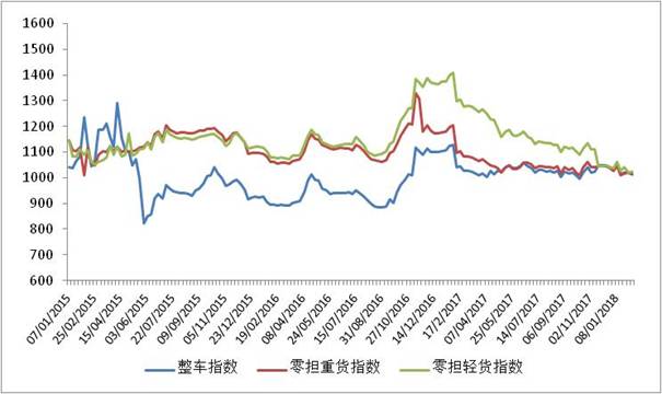 各車型指數(shù)漲跌不一,其中整車指數(shù)、零擔重貨指數(shù)環(huán)比回落,零擔輕貨指數(shù)小幅回升。其中,整車指數(shù)為1014.41點,比上周回落0.58%;零擔重貨指數(shù)為1012.78點,環(huán)比回落0.59%;零擔輕貨指數(shù)為1022.08點,環(huán)比回升0.08%。
