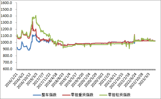 分車型看,各車型指數(shù)環(huán)比漲跌互現(xiàn)。其中,整車指數(shù)為1024.59點,比上周回升0.04%;零擔(dān)輕貨指數(shù)為1020.17點,比上周回落0.02%;零擔(dān)重貨指數(shù)為1023.64點,比上周回落0.11%。