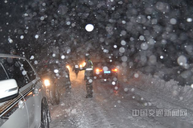 3月11日晚,武警交通二支隊官兵在暴風(fēng)雪中疏導(dǎo)川藏線被困車輛。王毅凱 攝