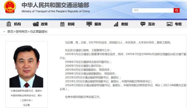 交通運(yùn)輸部官網(wǎng)“領(lǐng)導(dǎo)網(wǎng)頁”欄目信息顯示,現(xiàn)任交通運(yùn)輸部黨組副書記、副部長(zhǎng),中國(guó)民用航空局黨組書記、局長(zhǎng)馮正霖(1957.9)已于2017年4月明確為正部長(zhǎng)級(jí)。