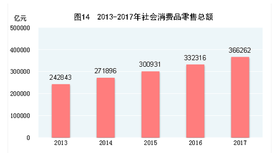 在國內(nèi)貿(mào)易方面,全年社會(huì)消費(fèi)品零售總額366262億元,比上年增長10.2%。按經(jīng)營地統(tǒng)計(jì),城鎮(zhèn)消費(fèi)品零售額314290億元,增長10.0%;鄉(xiāng)村消費(fèi)品零售額51972億元,增長11.8%。按消費(fèi)類型統(tǒng)計(jì),商品零售額326618億元,增長10.2%;餐飲收入額39644億元,增長10.7%。