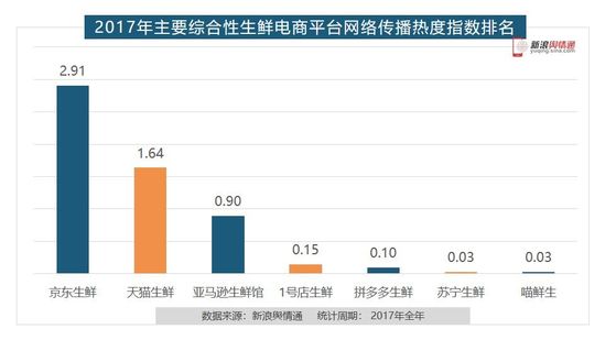 據(jù)《每日經(jīng)濟新聞》報道,天貓生鮮目前占據(jù)著我國生鮮電商市場超過80%的市場份額,但在2017年輿論關(guān)注度方面,京東生鮮卻更為搶鏡。據(jù)新浪輿情通大數(shù)據(jù)分析顯示,2017年,在主要生鮮電商平臺中,京東生鮮全年網(wǎng)絡(luò)輿情傳播熱度指數(shù)2.91,領(lǐng)跑其他生鮮電商平臺,天貓生鮮、盒馬鮮生、亞馬遜生鮮館、京東到家、美團生鮮、永輝超級物種、易果生鮮、每日優(yōu)鮮、順豐優(yōu)選全年熱度緊隨其后。