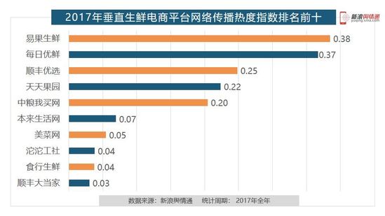 與綜合性生鮮電商不同,垂直生鮮電商一般會從生鮮產(chǎn)品源頭開始介入產(chǎn)業(yè)鏈的各個環(huán)節(jié),全程把控供應(yīng)鏈,保證商品品質(zhì)和用戶體驗。在主要垂直生鮮電商平臺中,據(jù)新浪輿情通大數(shù)據(jù)分析顯示,2017年,易果生鮮、每日優(yōu)鮮、順豐優(yōu)選網(wǎng)絡(luò)傳播熱度指數(shù)排名前三位,天天果園、中糧我買網(wǎng)、本來生活網(wǎng)、美菜網(wǎng)、沱沱工社、食行生鮮、順豐大當家熱度排名四到十位。