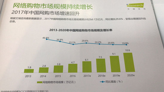 數(shù)據(jù)顯示,2017年中國(guó)網(wǎng)絡(luò)購(gòu)物市場(chǎng)交易規(guī)模預(yù)計(jì)約為6.1億元,同比增長(zhǎng)29.6%,較前幾年有小幅度的回升。